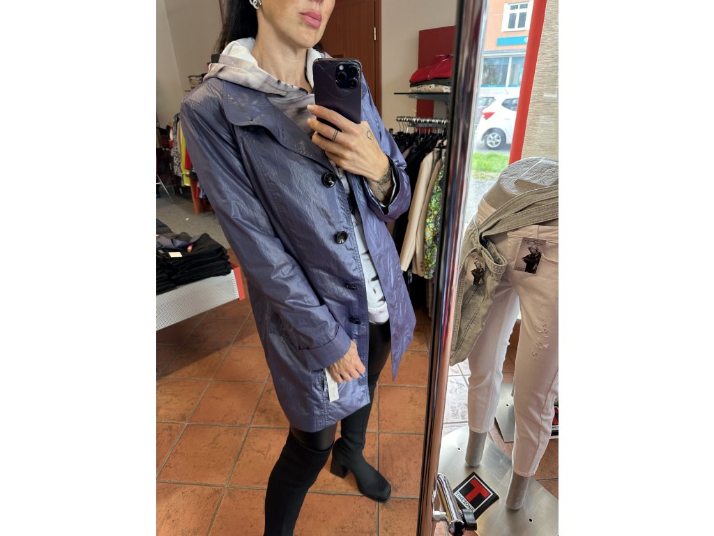 Lehký přechodový kabát v odstínech modré s páskem na uvázání.